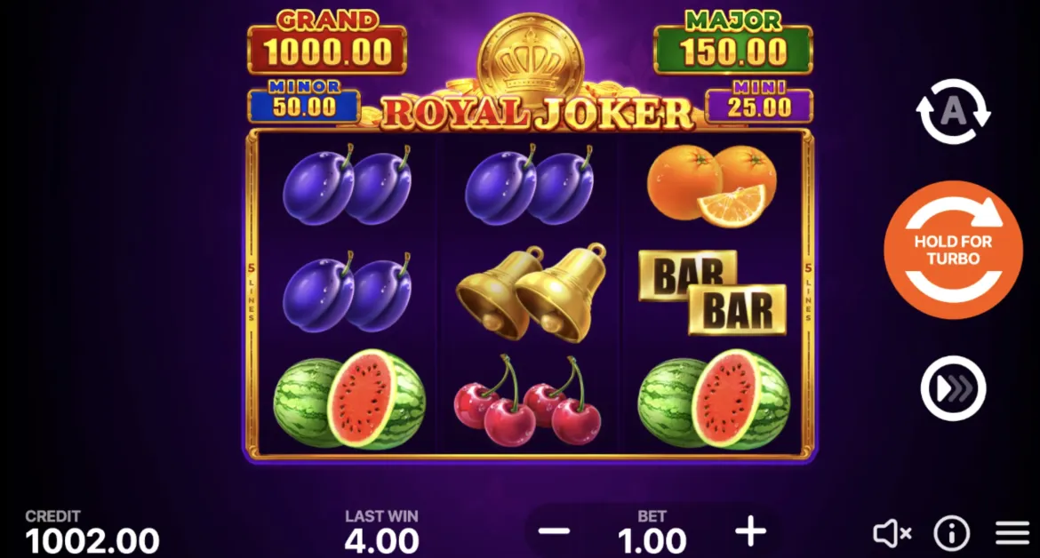 Royal Joker: Hold and Win from Playson fuses the nostalgic appeal of a traditional fruit slot with contemporary, thrilling mechanics. This engaging online game unfolds on a 3x3 reel set with 5 fixed paylines, boasting high volatility and the potential for payouts reaching 21,150x your bet. It distinguishes itself through captivating bonus features like respins, multiplier wilds, and a progressive jackpot ladder, delivering substantial excitement in an uncluttered package. Featuring lively graphics, a retro-inspired aesthetic, and interactive gameplay, Royal Joker: Hold and Win attracts fans of vintage slots and modern players alike, all searching for significant rewards within a clear, straightforward framework. This fusion positions it as an attractive pick for anyone who appreciates timeless slot charm enhanced with today’s innovative touches.